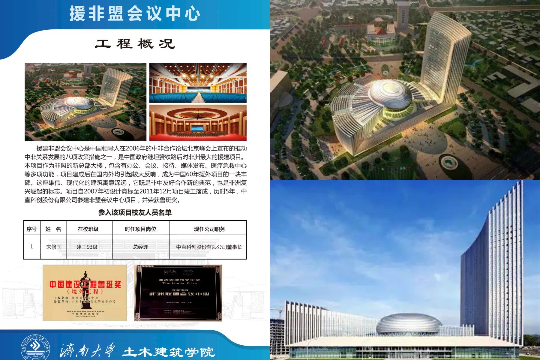 本项目作为非盟的新总部大楼,包含有办公、会议、接待、媒体发布、医疗急救中心等多项功能,项目建成后在国内外均引起较大反响,成为中国60年援外项目的一块丰碑。这座雄伟、现代化的建筑寓意深远,它既是非中友好合作新的典范,也是非洲复兴崛起的标志。项目自2007年初设计竞标至2011年12月项目竣工落成,历时5年,中直科创股份有限公司参建非盟会议中心项目,并荣获鲁班奖。