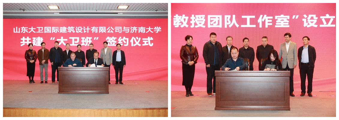 刘寒芳教授与张冰总经理代表双方签署山东大卫国际建筑设计有限公司“刘寒芳教授团队工作室”协议。