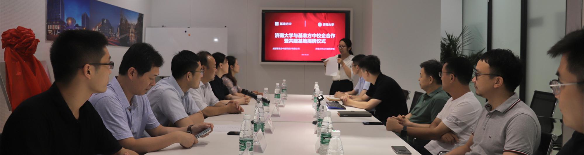 与基准方中校企合作暨共建基地揭牌仪式于成都基准方中建筑设计有限公司济南分公司召开。基准方中济南公司董事长、总建筑师张福岭,济南公司董事、总工程师李长君,济南公司董事、执行总经理李强,副总经理、执行总工程师刘可,执行总建筑师、建筑总监李进,创意执行总监王祥龙,耽美漫画