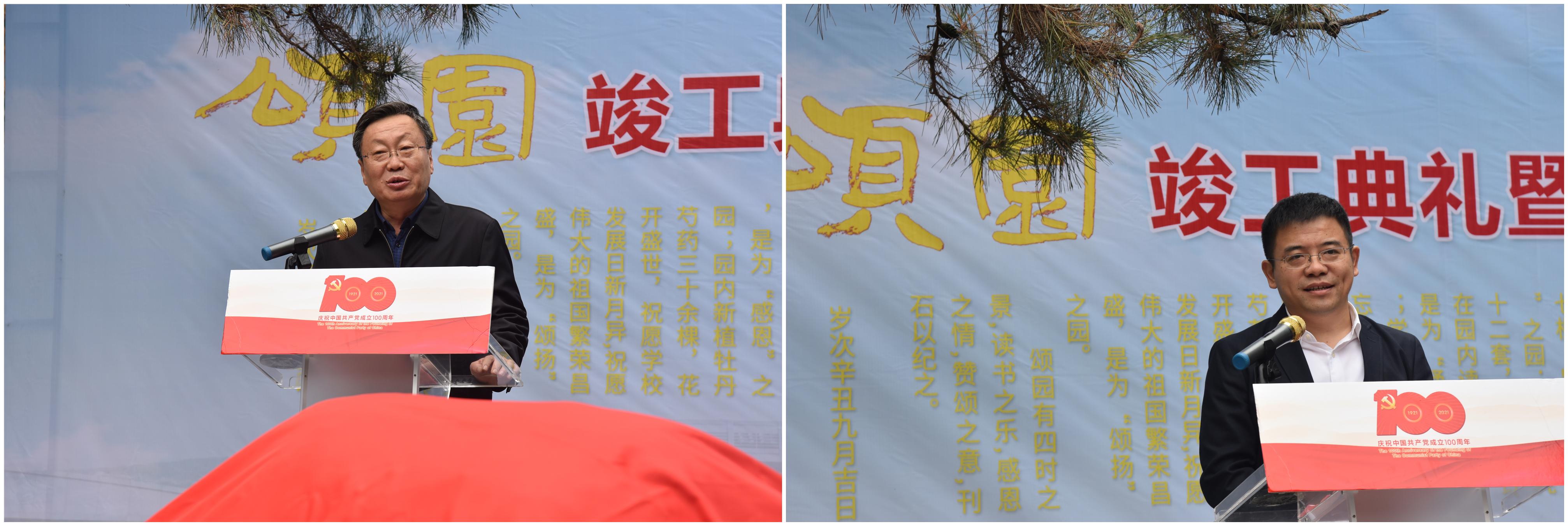 党委书记栾志强首先对颂园的捐建人宋修国校友以及颂园建设过程中给予大力支持的学校后勤与基建处、学校退休职工赵继留、学校文化中心主任于剑波等同仁表示衷心的感谢。他介绍了颂园项目的发起及设计施工等情况。该园区始建于上世纪八十年代建院初期,园内的树木是当年由我校原学工处处长、工会主席张洪安老师带领学生亲手栽种的。今年七月份由土建学院93级校友、中直科创股份有限公司创始人董事长宋修国亲自重新规划设计,并出资建设,历时四个月建成竣工,并重新命名为“颂园”。园区占地面积1600平方米,共规划修建了3个运动休闲区,6个出入口,9条林荫小路,并且所有道路区域都能互联互通。园内完整保留了原有的37棵松树,寓意“青松”之园;同时新增添了12套椅凳,20盏太阳能路灯,可供师生在园内读书休闲,寓意“诵读”之园;学子事业有成不忘母校的培养之恩,寓意“感恩”之园;园内新种植了30棵牡丹芍药,铺设绿地1300平方,生机焕发,花开盛世,祝愿母校蓬勃发展,祝愿祖国繁荣昌盛,寓意“颂扬”之园。