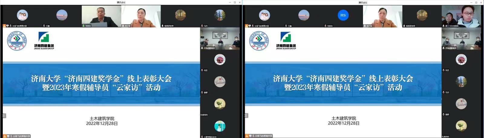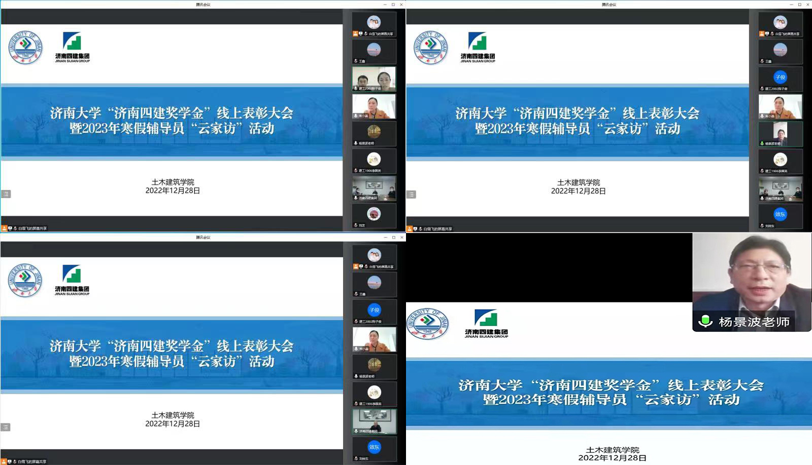 “济南四建奖学金”线上表彰大会暨2023年寒假辅导员“云家访”活动。济南四建(集团)有限责任公司董事长、党委书记李力,党委委员、纪委书记兰利孝,技术质量部部长赵得铭,人力资源部部长经琦,人力资源部副部长杨电辉参加了活动;耽美漫画