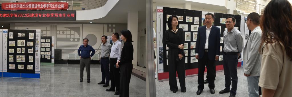 现场同学为与会领导介绍了自己的作品,韩盛华作为此次写生的指导老师,也从专业的角度向领导们讲解了每幅作品的风格和亮点。与会领导肯定并赞扬了同学们的写生作品,同时在现场也对同学们的作品提出指导性意见,同学们认真听讲,受益匪浅。