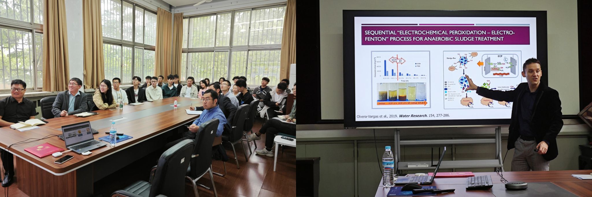 Olivier教授以《Electrochemical Treatment of Industrial Wastewater》为题作报告。报告从工业废水处理的难点出发,重点介绍了其课题组在电-芬顿技术关键材料领域所取得的研究成果,市政系师生听取报告并与Olivier教授进行了更深入的学术交流。