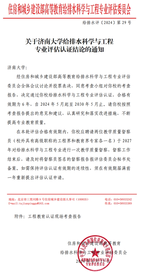 6月22日,我校接到住房和城乡建设部高等教育给排水科学与工程专业评估委员会通知,给排水科学与工程专业顺利通过评估认证,有效期6年,成为我校第一个通过专业评估(认证)复评的专业。