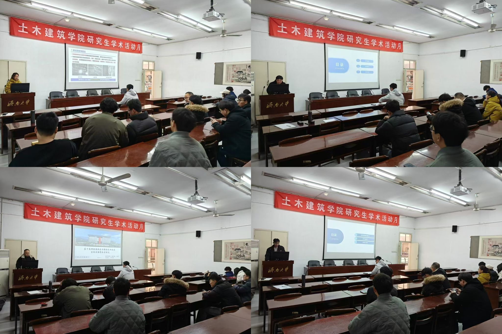 李祥龙以“基于监测数据的悬索桥温度场效应分析”为题,通过对长期监测数据的收集、整理与分析,探讨温度变化对悬索桥结构行为的影响规律;陈国辉以“再生泡沫混凝土单轴受压应力-应变试验研究”为题,对再生泡沫混凝土与其他材料组合结构的力学性能研究,拓展其在工程中的应用范围;朱利帅以“目标特征损失下基于深度学习的结构位移监测研究”为题,利用机器视觉与人工智能融合的方法,对建筑结构的位移实行更为精准的监测;王文博同学以“老旧混凝土空心砌块增韧加固力学性能试验研究”为题通过试验研究,系统地分析不同增韧加固方法对老旧混凝土空心砌块力学性能的影响,包括抗压强度、抗折强度、弹性模量等指标的变化规律。