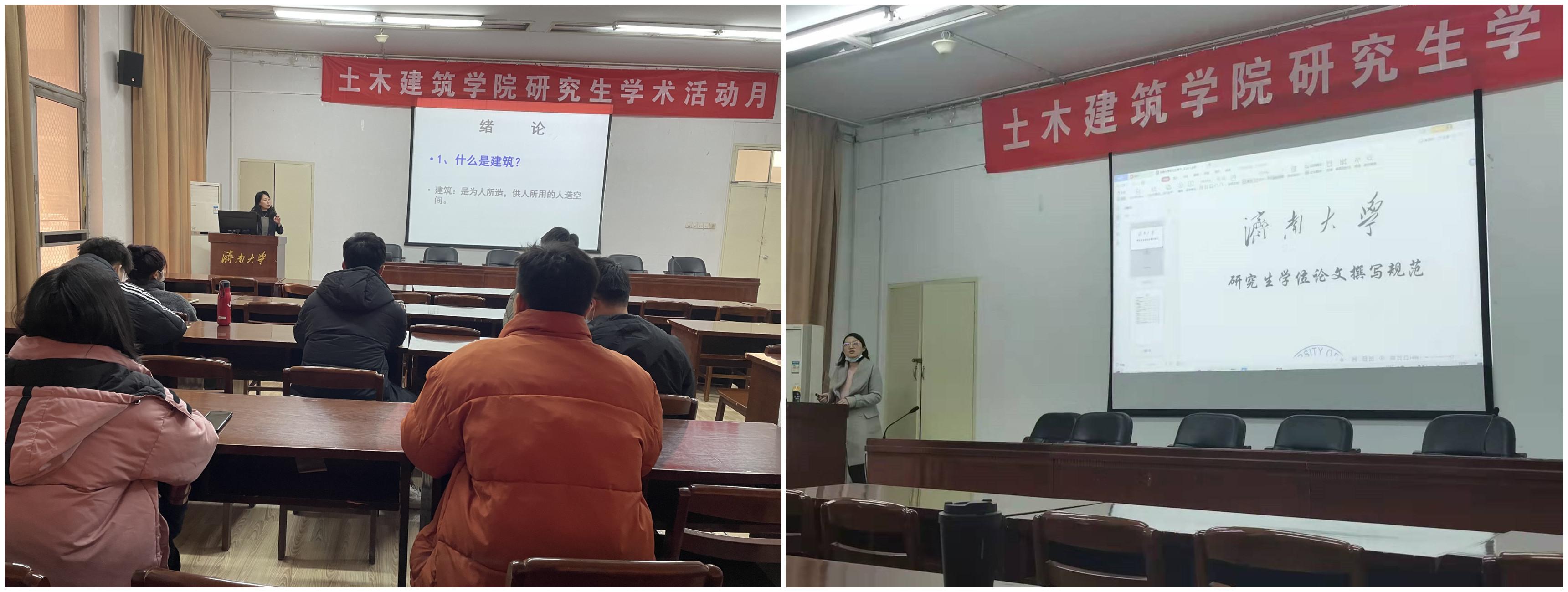 在本次学术报告中,刘寒芳老师首先做出题为“建筑学的发展历程”的主题报告,刘寒芳老师向在场师生介绍建筑学的性质、分类以及发展历程等,通过介绍各个时期的建筑,让同学们了解到了建筑学是一门横跨工程技术和人文艺术的学科,刘老师的报告引起了在场师生的强烈兴趣。王蕾老师做出题为”研究生撰写论文规范“的主题报告,王蕾老师就”学位论文格式“和”专家评审意见“两方面展开此次报告,让同学们认识到了学位论文格式的重要性,通过专家评审意见和案例,给同学们细致认真的讲解了在撰写学位论文时需要注意的有关事项,提高自己的语言表达能力。之后,14位研究生就各自的研究成果做出相应报告,在报告中,同学们相互探讨,积极交流,学术氛围浓烈。