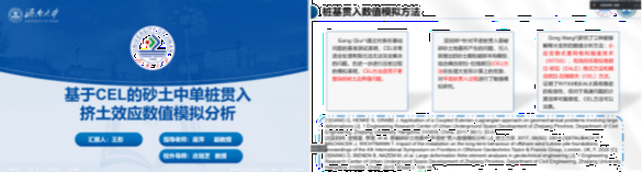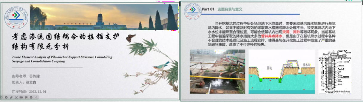 牛金帝同学以我国地震频发、水库土石坝多等现象为背景,通过依托于济南某水库土石坝的研究,详细介绍了自己的研究课题——液化场地水库土石坝地震响应及稳定性分析。