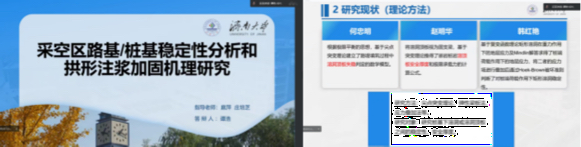 谭浩同学立足于采空区易活化、隐伏性强、顶板冒落塌陷情况等难以预测的特点以及采空区灾难频发、对地面构筑物破坏大的问题,通过对采空区路基/桩基的稳定性进行分析进而对采空区注浆拱加固技术进行创新。