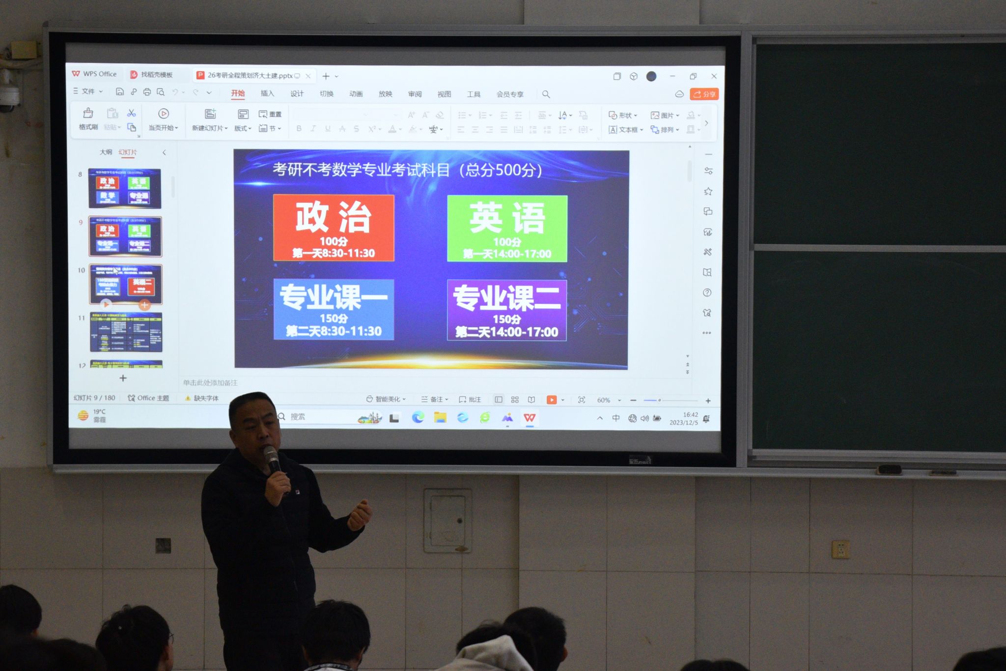 会议邀请专家老师为2022级学生开展考研动员,他用简洁明了的语言,结合生动的案例和数据,介绍了考研报名和考试流程、学硕和专硕的区别、考试科目重点分析、选择本专业还是跨专业、各个专业门类分析以及大二考研学习准备等方面的内容。老师强调了考研复习的关键性和策略性,建议同学们要根据自己的实际情况和水平,制定合理的复习计划,注重知识的积累和运用。在宣讲过程中,老师多次提到要保持良好的考研心态,并且要在大一和大二阶段打好基础。现场互动环节,通过了解学生的高考成绩和目前英语学习情况,有针对性地提出报考建议,在场学生频频点头,气氛热烈。