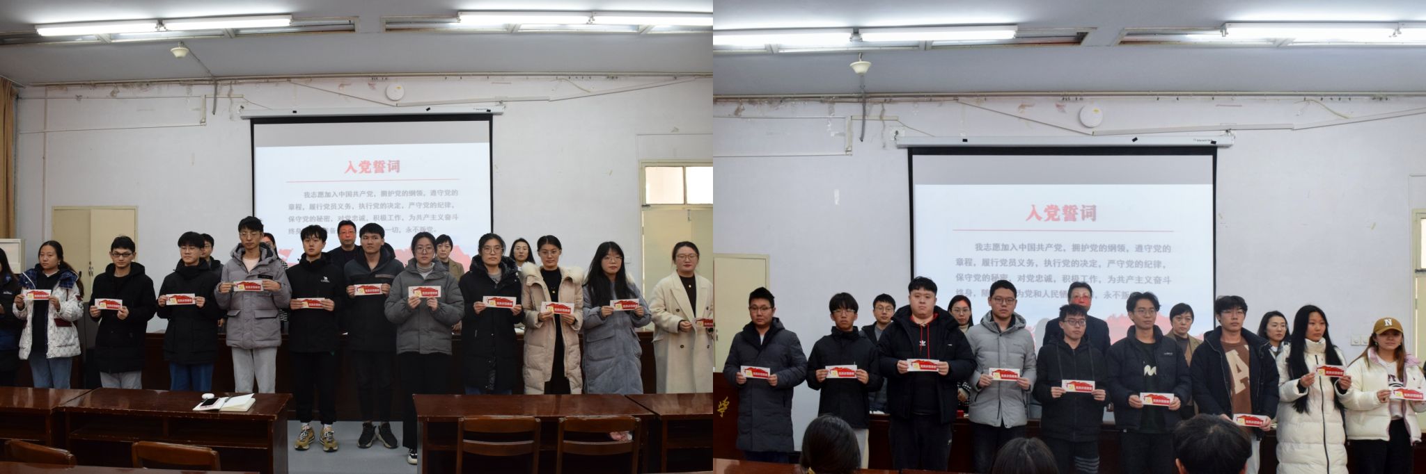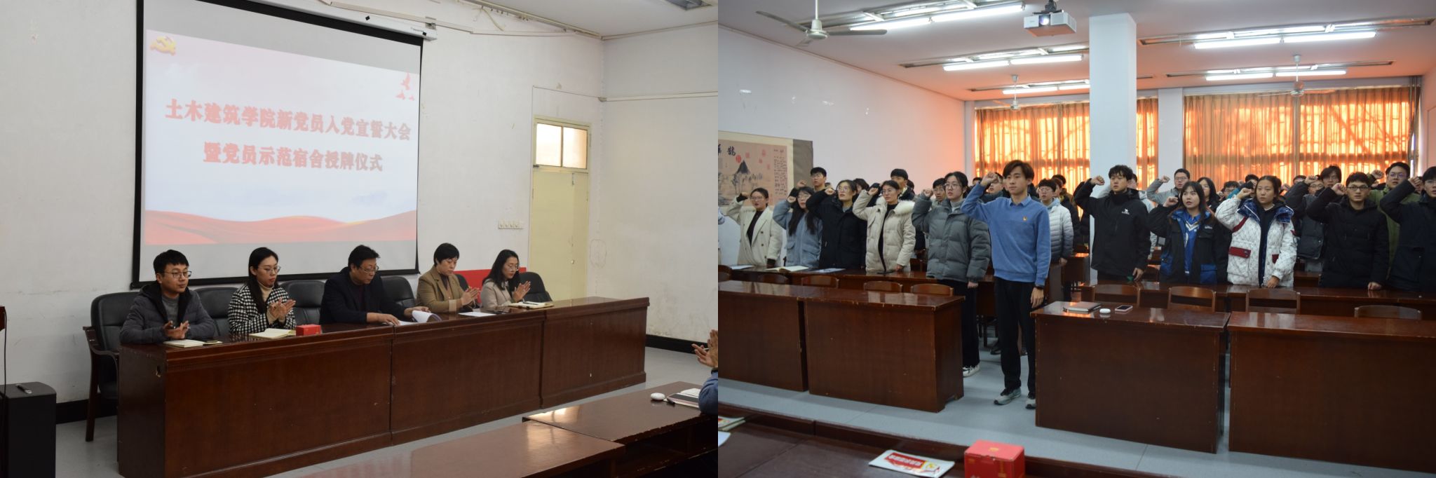 首先进行了入党宣誓仪式,47名新党员在党员代表王凡韬的带领下面向党旗庄严宣誓,牢记入党初心,践行入党誓词。随后与会领导将“党员示范宿舍”这个既代表荣誉更代表责任的标志授予新党员同学们,由他们亲手张贴在自己的宿舍门上,以此作为鞭策自我,树立责任意识的警示。