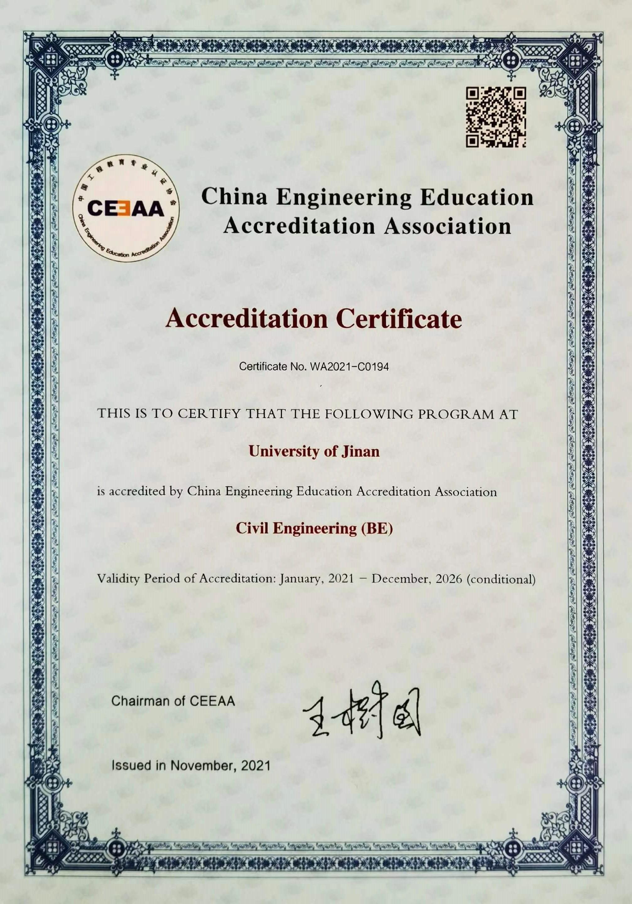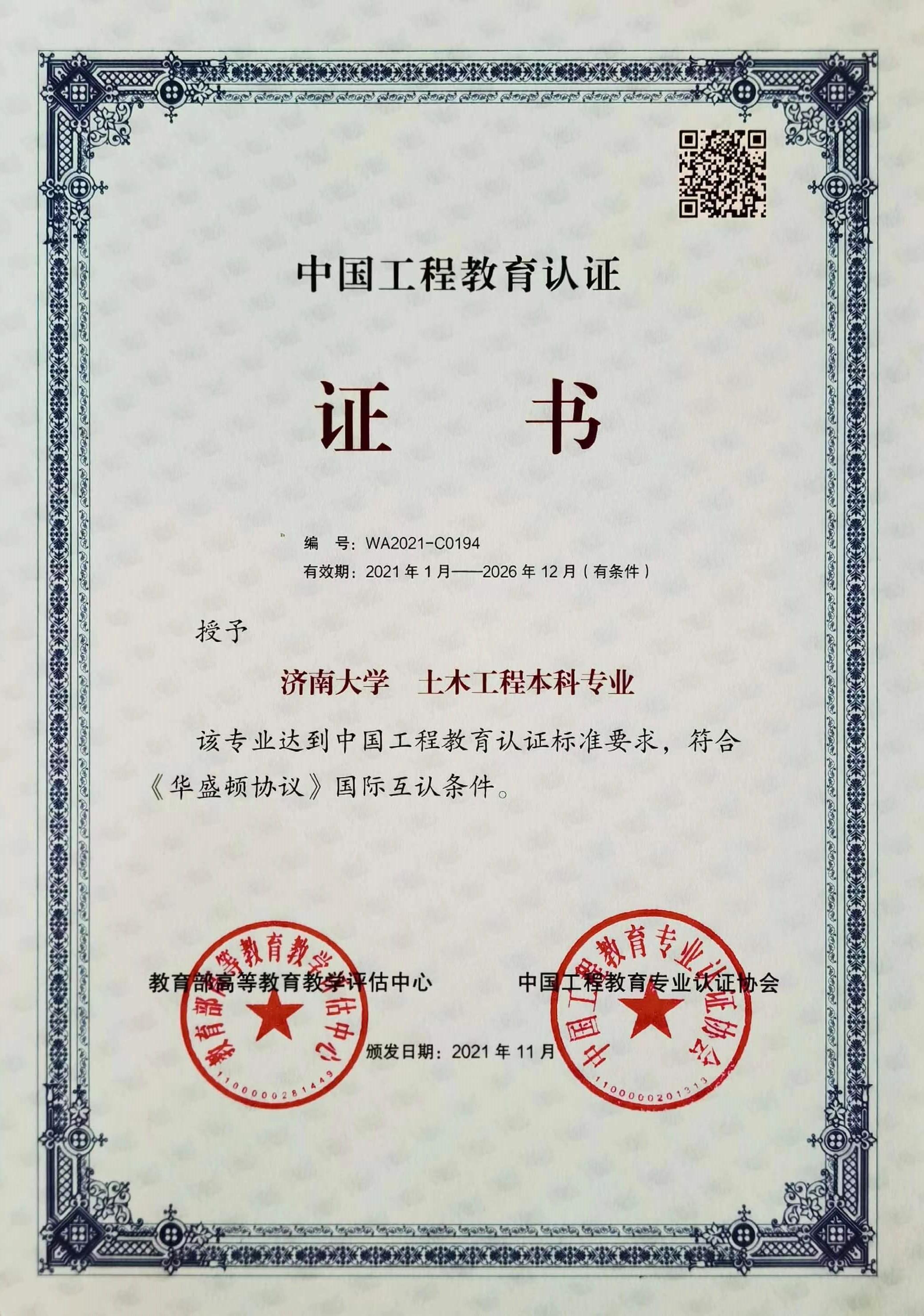 土木工程专业颁发认证证书,认证时效6年(2021年1月-2026年12月)。