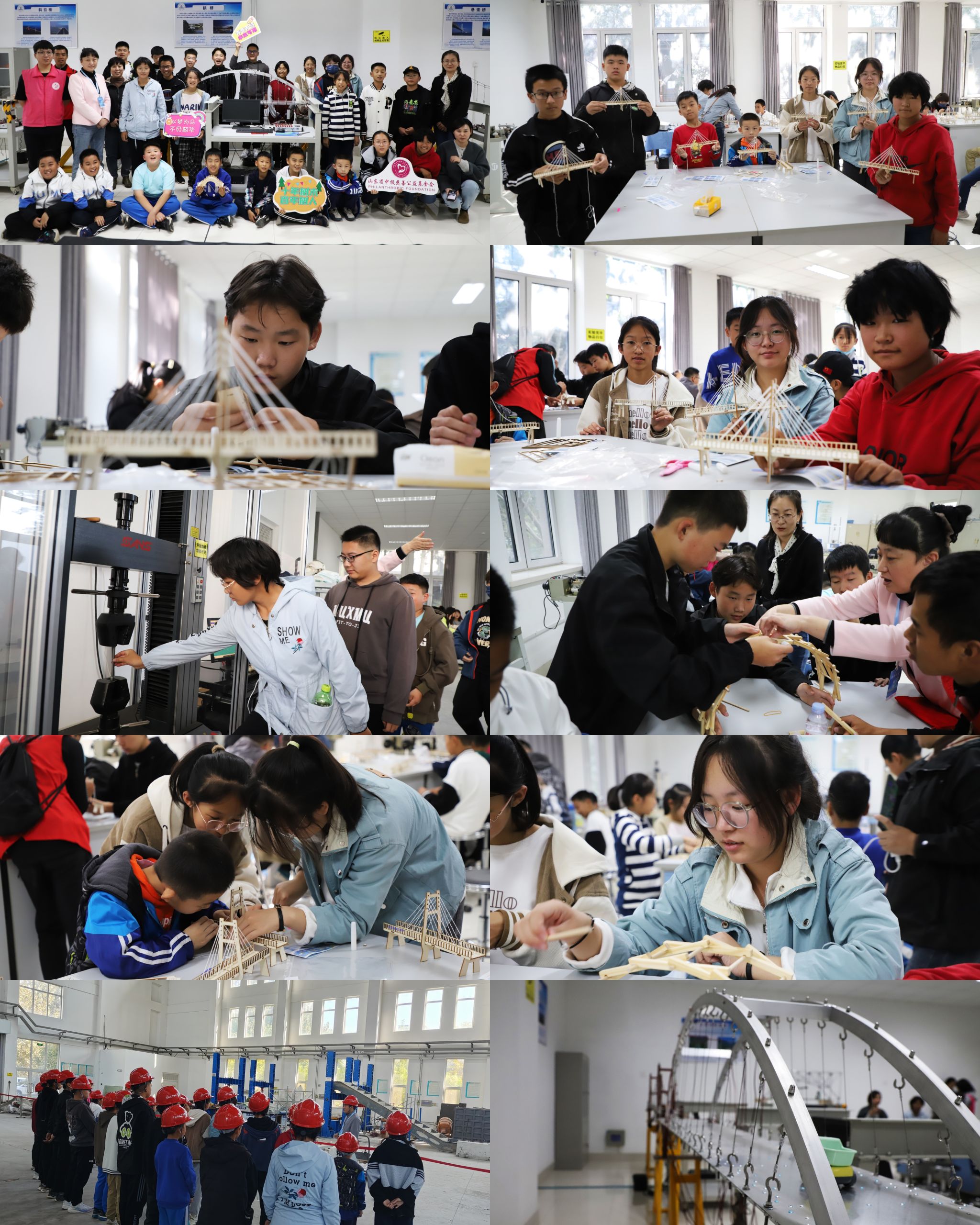 实验中心开启了探索实践之旅。在参观体验环节,学院实验中心的老师们在桥梁模型实验室,耐心细致的向学生们讲解桥梁基础知识,贯穿古今的桥梁历史犹如一部画卷在孩子们面前徐徐展开。在结构实验室,学生们体验了1500平米的广阔实验空间,观看了体型巨大的实验设备。并在力学实验室,利用大仪设备开展钢材拉伸实验,感受钢材在破坏过程中形态、颜色和热量变化。在动手实践环节中,同学们认真地听了老师们对斜拉桥、倍力桥基础原理与建设的讲解后,自己动手制作斜拉桥和倍力桥模型,感受到了建筑智慧,也培养了学生们精益求精、锲而不舍的工匠精神。
