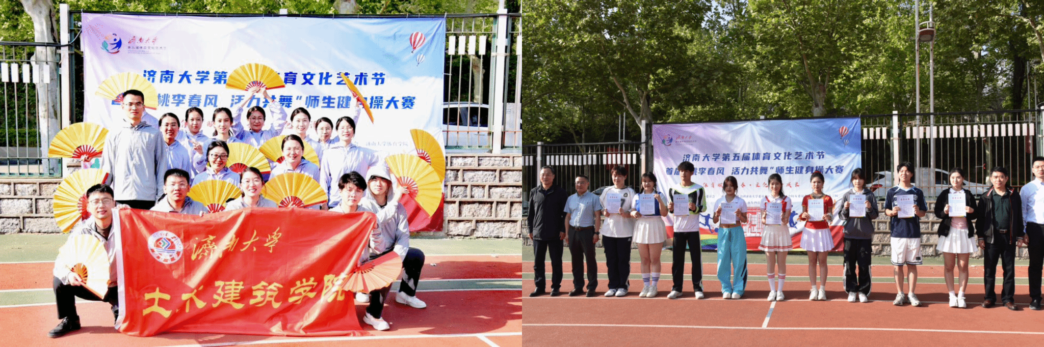 由16名教师组成的"匠心筑梦"队,身着运动服惊艳登场。队伍中既有班主任辅导员老师,也有我们的专业课老师,他们队形整齐、步伐轻盈,将灵动与坚韧交织、轻盈与热烈共绘,创新编排扇子国风元素,最终荣获教师组优秀组织奖,展现了土木教师课堂之外的别样风采。